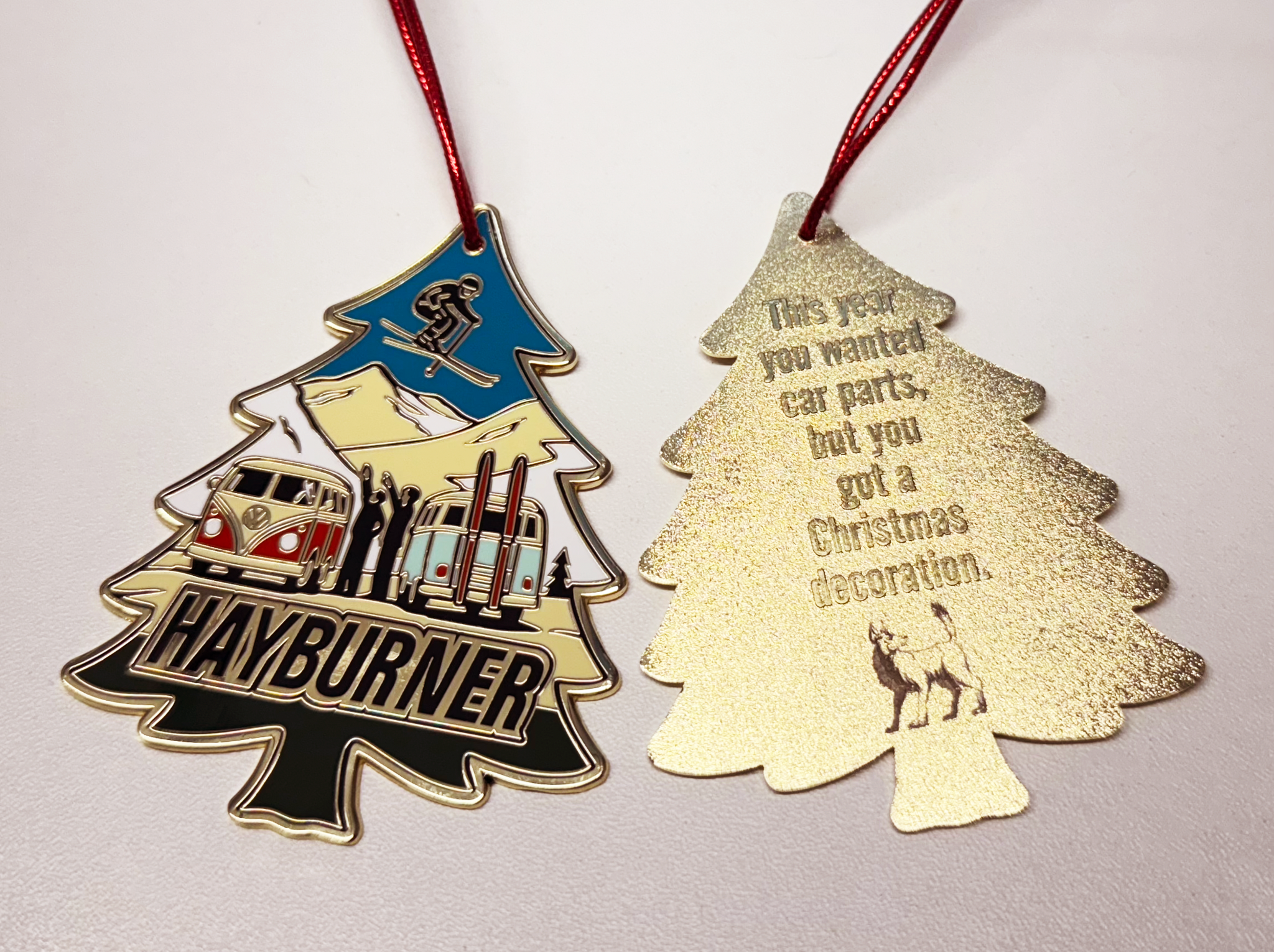 Finished with an embossed message: “This year you wanted car parts, but you got a Christmas decoration.”
